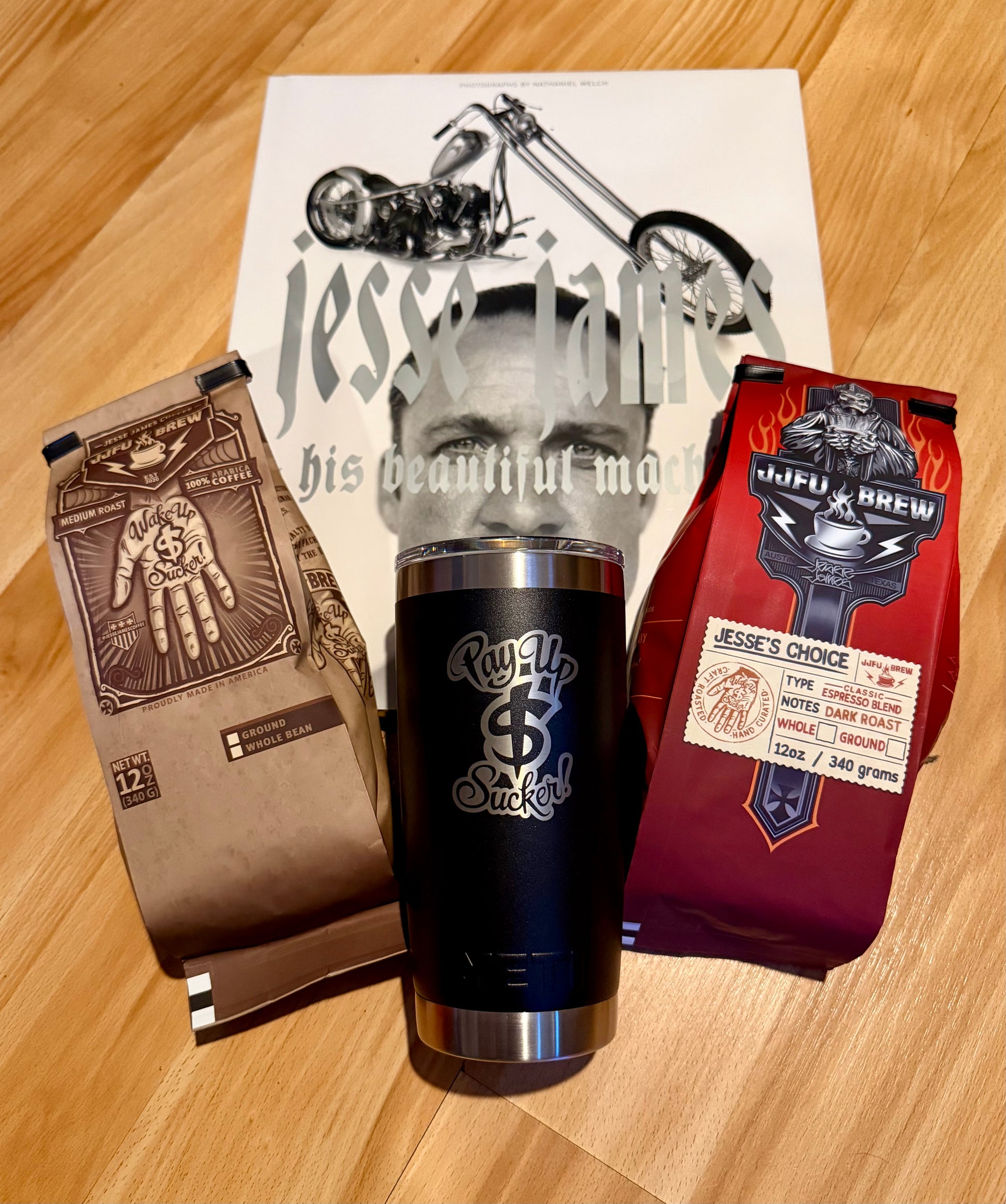 Coffee Connoisseur is the BEST savings deal we offer: A SIGNED Jesse James Coffee Table book (VALUED AT $300 ALONE), Jesse James Coffee 20oz Yeti Tumbler and one 12oz bag of each of our custom blends!